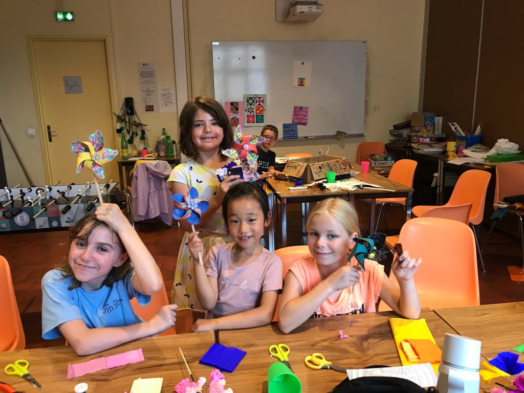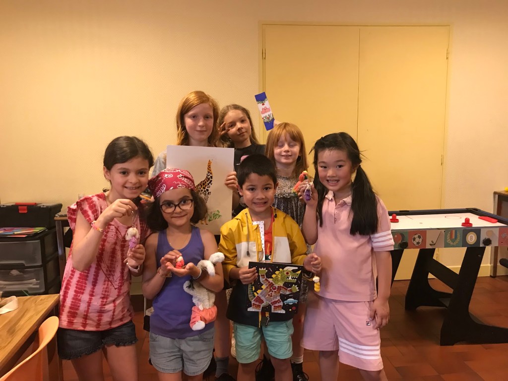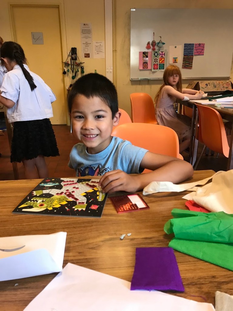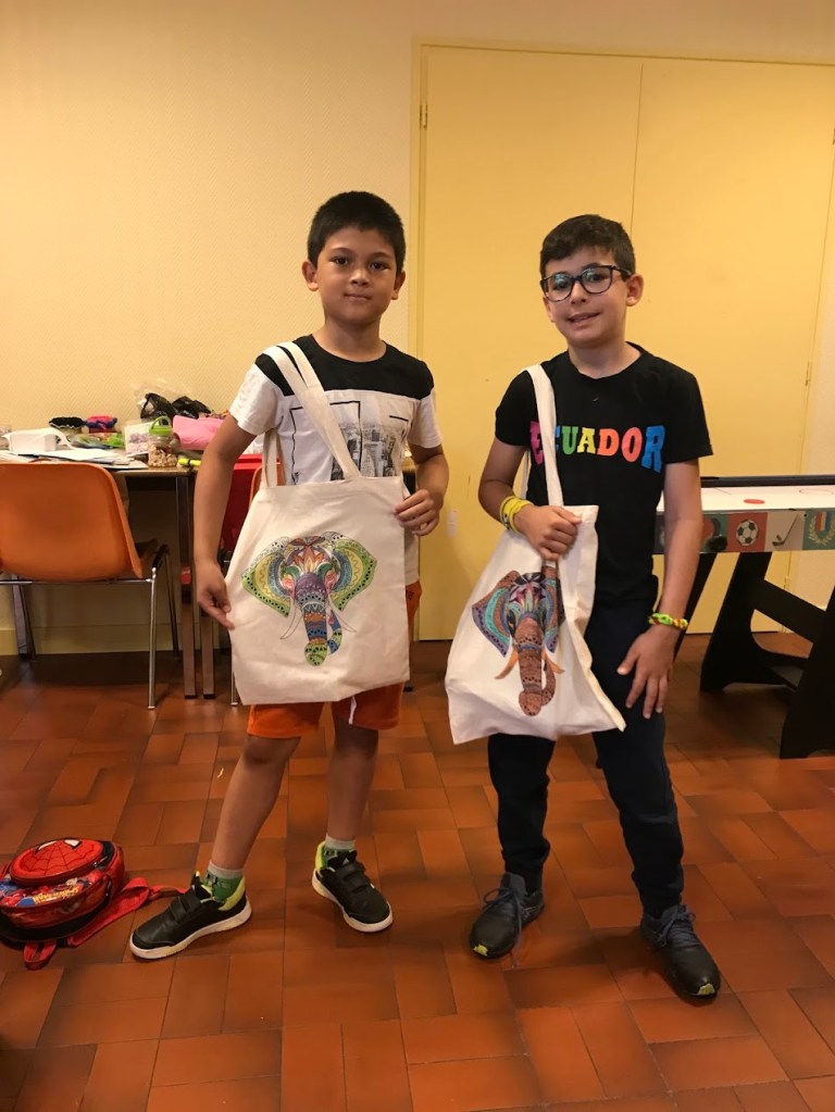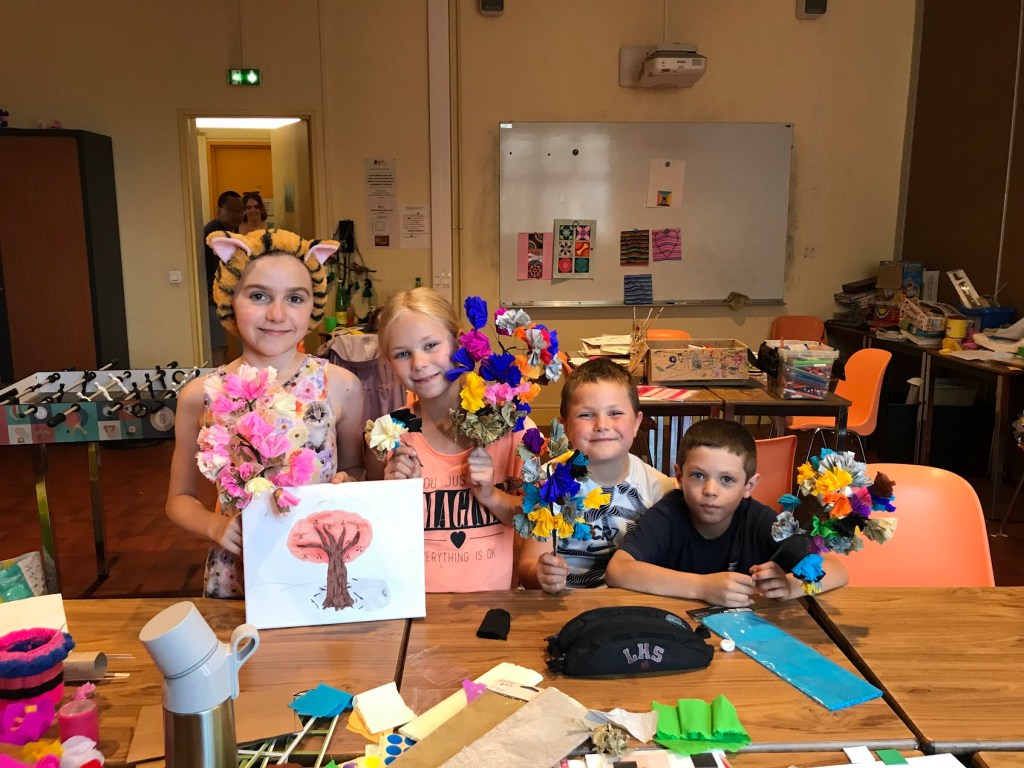 Nous avons sensibilisé les enfants aux problèmes écologiques dans des ateliers centrés sur l’anti-gaspillage: bien refermer les feutres et les peintures, économiser le papier, finir les oeuvres qu’on a commencé, ne pas avoir les yeux plus gros que le ventre au goûter etc.