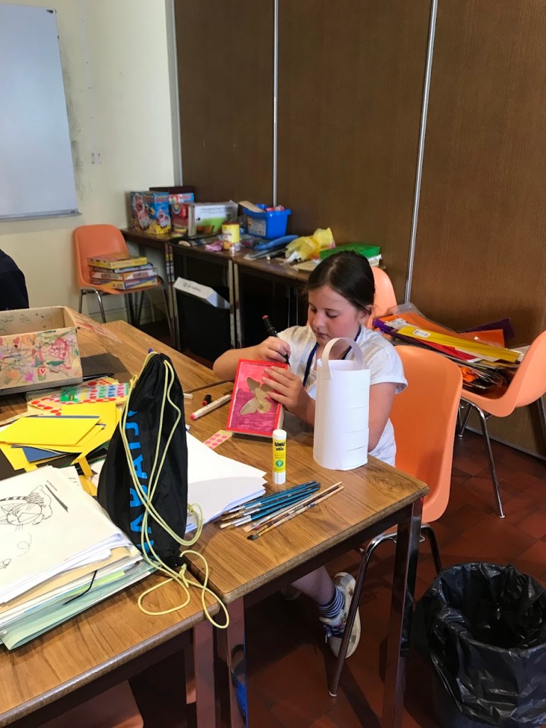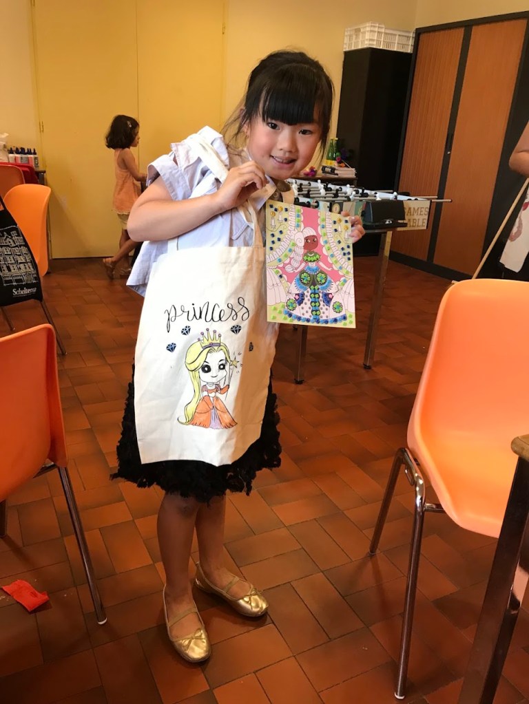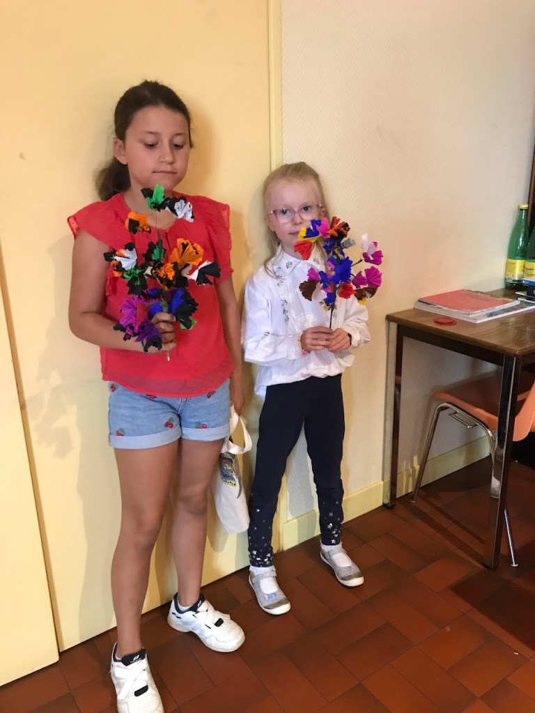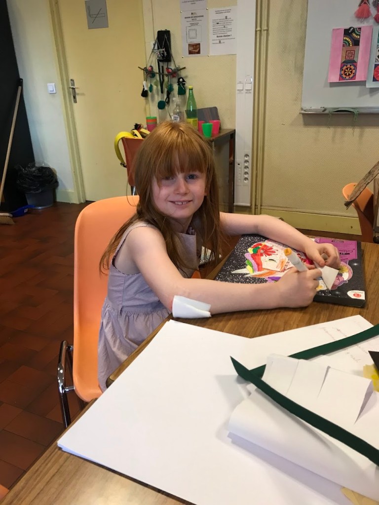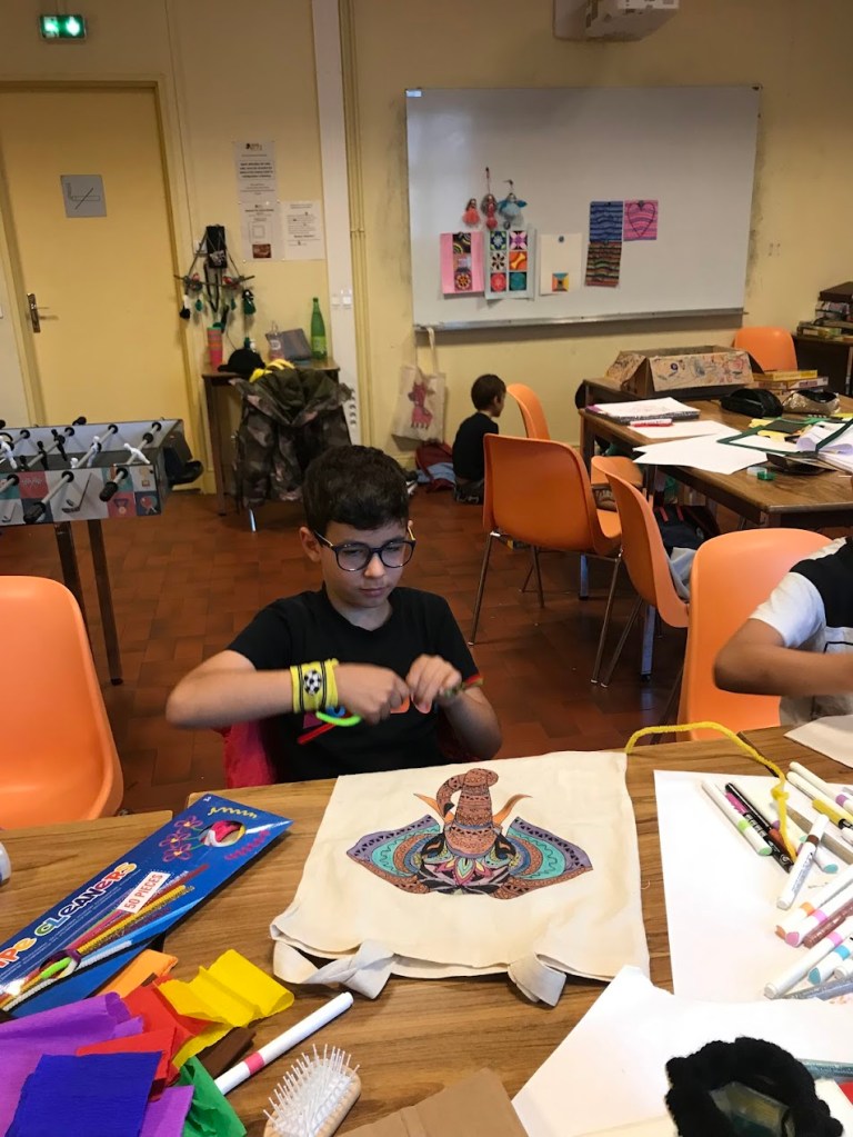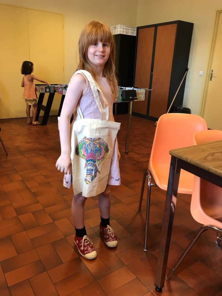 Nous avons sensibilisé les enfants aux problèmes écologiques dans des ateliers centrés sur l’anti-gaspillage: bien refermer les feutres et les peintures, économiser le papier, finir les oeuvres qu’on a commencé, ne pas avoir les yeux plus gros que le ventre au goûter etc.
